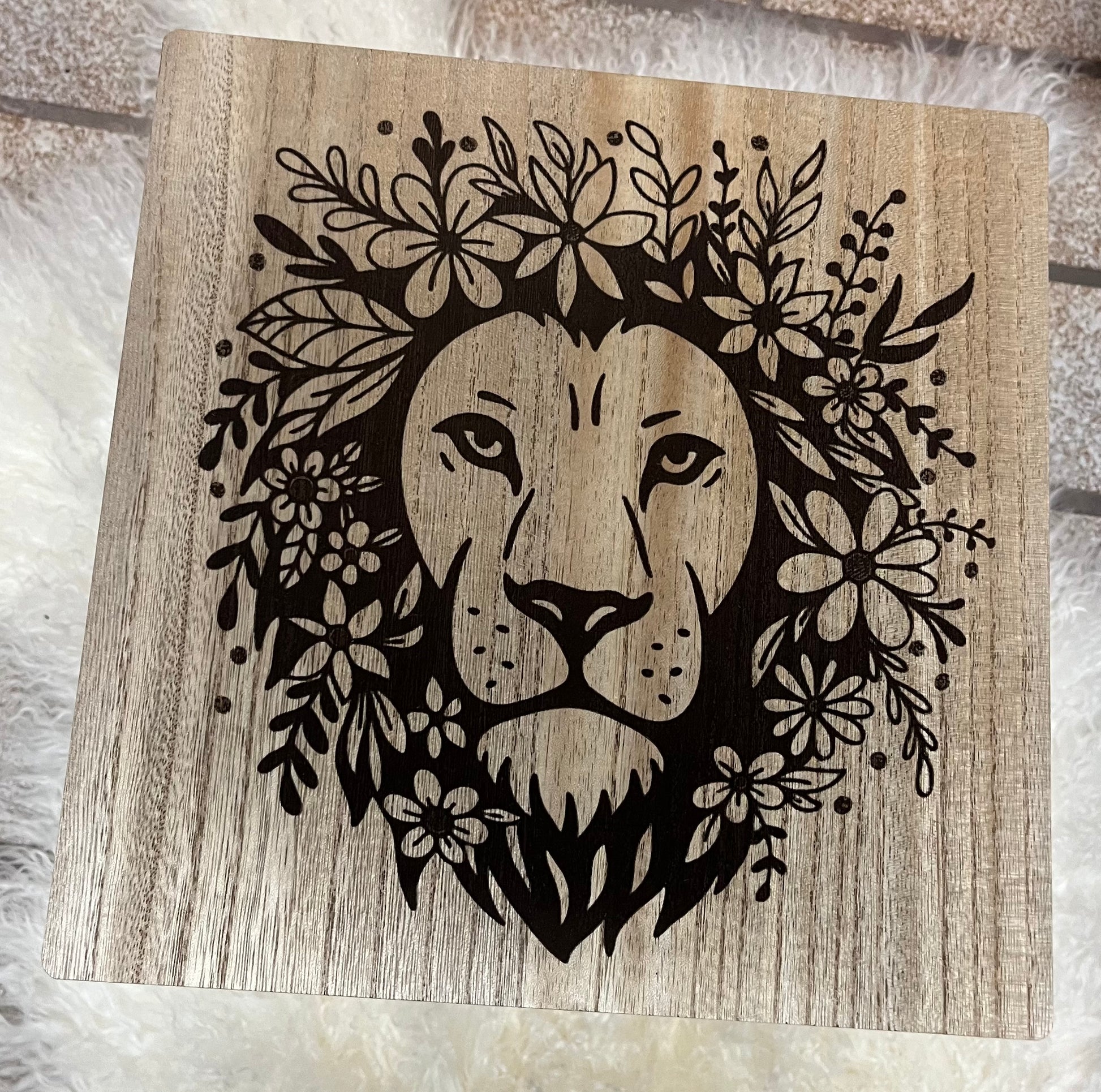 Dieser außergewöhnliche Beistelltisch verbindet modernes Design mit natürlicher Wärme. Das detailreiche Löwenmotiv mit floralen Elementen wird präzise mit moderner Lasertechnik in die Holzplatte graviert – für eine langlebige, hochwertige und gestochen scharfe Optik.