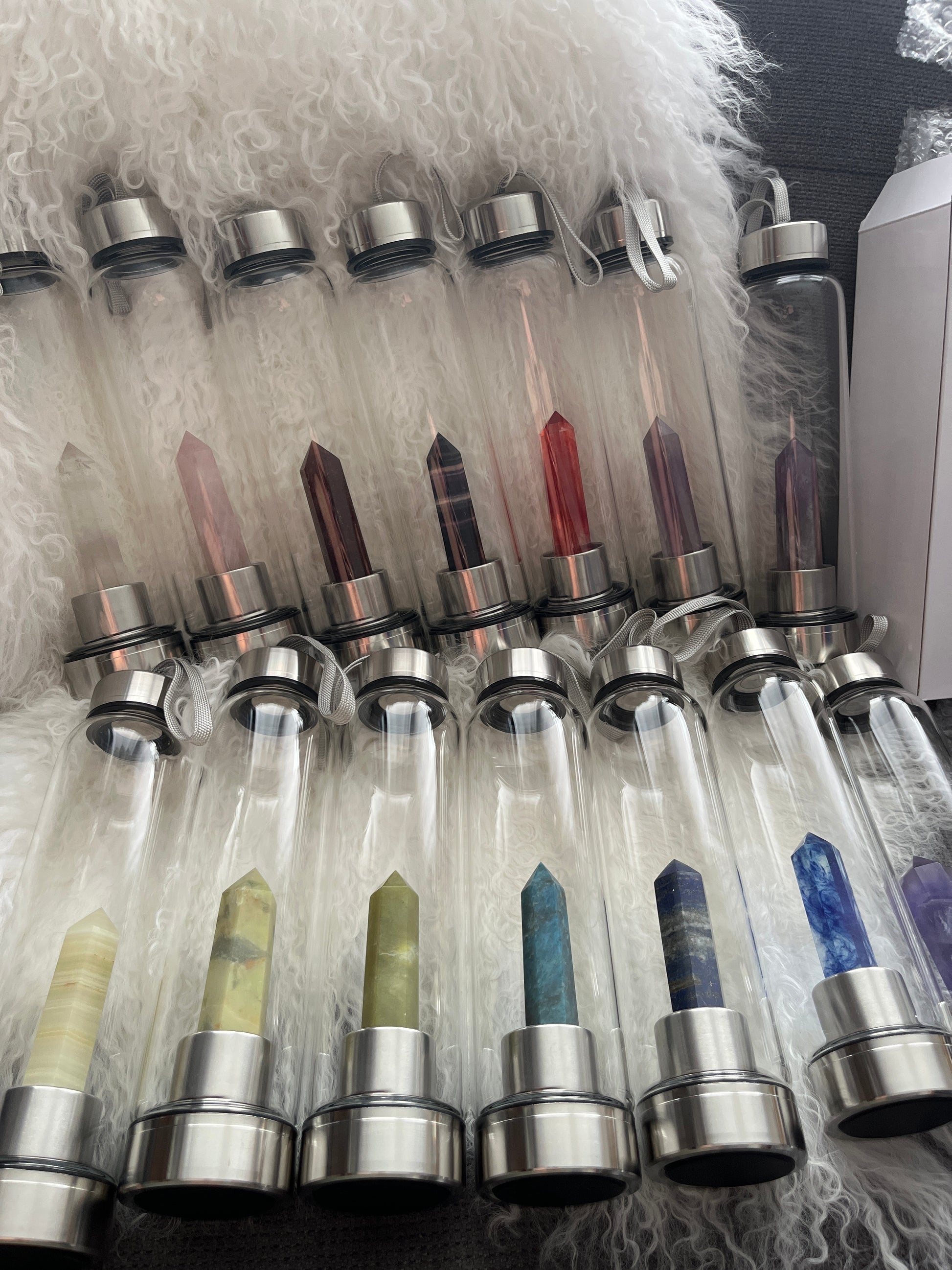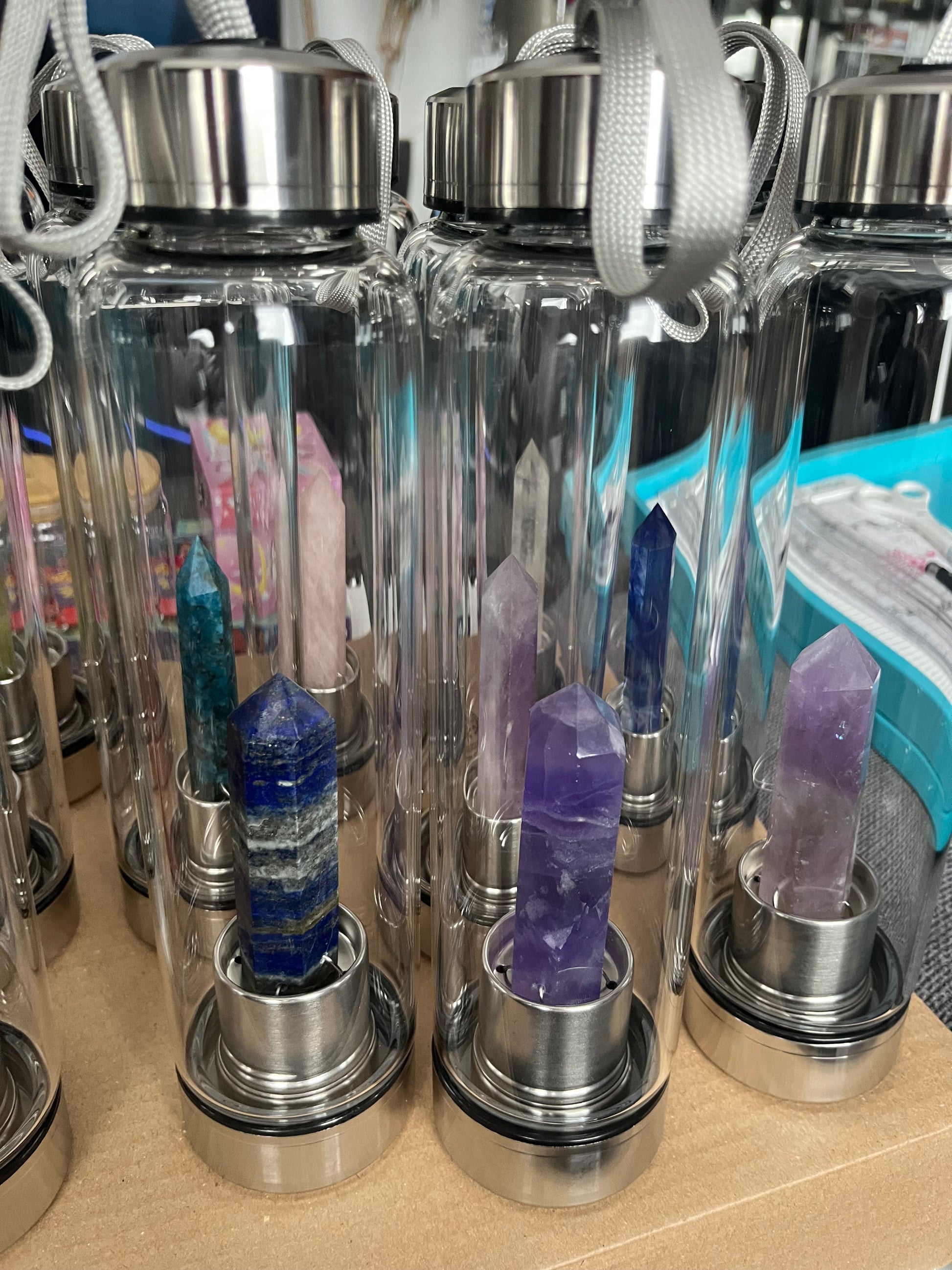 Bleib hydratisiert und umgib dich mit positiver Energie! Diese wunderschönen Glasflaschen mit Edelsteinen sind nicht nur stylisch, sondern bringen auch die Kraft der Kristalle in deinen Alltag. Ob Amethyst, Rosenquarz oder Sodalith – finde den Stein, der dich am besten unterstützt.